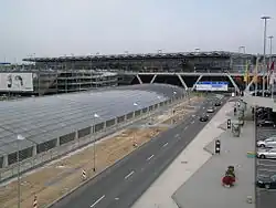The station, which is located in the area between the two airport terminals, is spanned over a length of 156 m (512 ft) with a 36 m (118 ft)-wide steel and glass roof.[6][10] The 540 tonne roof covers an area of 6,100 square metres (66,000 sq ft).[11]