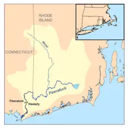 The western boundary with Connecticut Colony was defined ambiguously as the "Narragansett River" in the Connecticut charter, which was decided by arbitrators in 1663 to be the Pawcatuck River from its mouth to the Ashaway River mouth, from which a northward line was drawn to the Massachusetts line. This resolved a long-standing dispute concerning the former Narragansett lands which were also claimed by Connecticut and Massachusetts, although the dispute continued until 1703, when the arbitration award was upheld. After repeated surveys, a mutually agreeable line was defined and surveyed in 1728.[22]