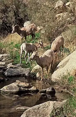 Common desert wildlife include mule deer, bobcat, desert kangaroo rat, cactus mouse, black-tailed jackrabbit, Gambel's quail, and red-diamond rattlesnake. Among sensitive species are flat-tailed horned lizard, Coachella Valley fringe-toed lizard, desert tortoise, prairie falcon, Andrews' dune scarab beetle, peninsular bighorn sheep, and California leaf-nosed bat.[4] The best place to spot wildlife is at the wetland refuges along the Colorado River, Cibola National Wildlife Refuge and Imperial National Wildlife Refuge.[6]