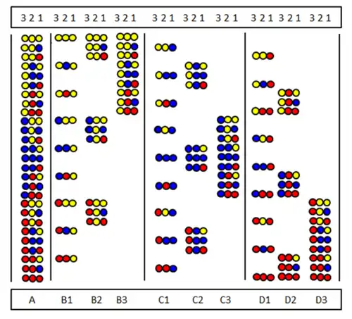Positional scanning was introduced independently by Furka et al.[34] and Pinilla et al.[35] The method is based on the synthesis and testing of series of sublibraries. in which a certain sequence position is occupied by the same amino acid. The figure shows the nine sublibraries (B1-D3) of a full peptide trimer library (A) made from three amino acids. In sublibraries there is a position which is occupied by the same amino acid in all components. In the synthesis of a sublibrary the support is not divided and only one amino acid is coupled to the whole sample. As a result, one position is really occupied by the same amino acid in all components. For example, in the B2 sublibrary position 2 is occupied by the "yellow" amino acid in all the nine components. If in a screening test this sublibrary gives positive answer it means that position 2 in the active peptide is also occupied by the "yellow" amino acid. The amino acid sequence can be determined by testing all the nine (or sometime less) sublibraries.