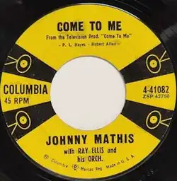 "Come to Me" was written for an episode of the Kraft Television Theatre of the same name.[1] The song's lyricist, Peter Lind Hayes, also co-wrote the episode, which aired on December 4, 1957.[2] Johnny Mathis recorded the song on October 31 of that year with Mitch Miller producing and an orchestra conducted by Ray Ellis. It was released as a single on December 30.[1]