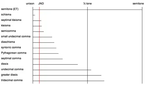 Comparison of the size of different commas, in cents. Equal-tempered semitone added for comparison. JND is the just-noticeable difference between tones.