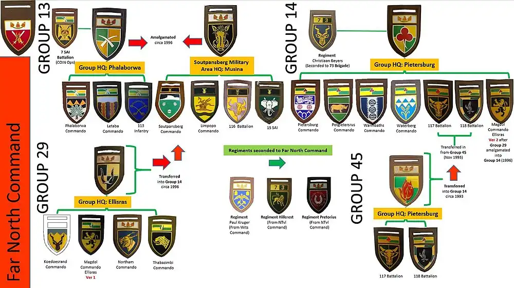 Under the SADF, Commando units were grouped regionally under Commands: (Please note: This was not a wholly static structure and units could move occasionally between Groups, the diagrams below depict the structure from the late 1980s)
