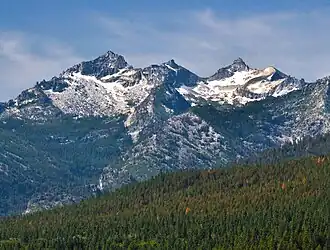 Como Peaks is west of the Continental Divide in the Bitterroot Range which is a subrange of the Rocky Mountains. It is the eighth-highest peak in Ravalli County as well as the eighth-highest point in the Selway–Bitterroot Wilderness which is managed by Bitterroot National Forest.[1] The nearest community is Darby, eight miles (13 km) to the east, and the nearest higher neighbor is El Capitan, 1.86 miles (2.99 km) to the west.[2] The mountain is a set of three peaks: the West Peak is the highest point at 9,624 feet, the Middle Peak is 9,537 feet,[4] and the East Peak is 9,493 feet.[5] Precipitation runoff from the mountain's slopes drains to the Bitterroot River. Topographic relief is significant as the summit rises 4,400 feet (1,341 meters) above Tin Cup Creek in two miles (3.2 km), and 5,400 feet (1,646 meters) above Lake Como in four miles (6.4 km). This mountain's toponym has been officially adopted by the United States Board on Geographic Names.[3] The mountain is named in association with nearby Lake Como which in turn was named by Antonio Ravalli in the 1840s for Lake Como in his native country of Italy.[6] Ravalli County is named after him. The mountain is also unofficially called the Three Sisters.[7]