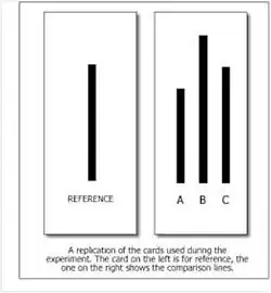 In Solomon Asch's experiment, 50 participants were placed in separate ambiguous situations to determine the extent to which they would conform. Aside from a single participant, the 7 other experiment members were confederates—individuals who understood the aim of the study and had been instructed to produce pre-selected responses. In the designated room, a picture of three lines of differing lengths was displayed. Each confederate was asked questions (e.g., which line is the longest, which line matches the reference line). In response, confederates gave largely incorrect answers.[20]