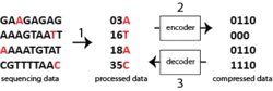 - ^ a b c Tembe, W.; Lowey, J.; Suh, E. (2010). "G-SQZ: Compact encoding of genomic sequence and quality data". Bioinformatics. 26 (17): 2192–2194. doi:10.1093/bioinformatics/btq346. PMID 20605925.