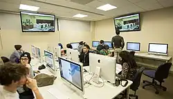 Computer labs are often subject to time limits in order to allow more people access to use the lab. It is also common for personal login credentials to be required for access.[1] This allows institutions to track the user's activities for any possible fraudulent use. The computers in computer labs are typically equipped with Internet access, scanners, and printers and are typically arranged in rows. This is to give the workstation a similar view to facilitate lecturing or presentations,[2] and also to facilitate small group work.[3]