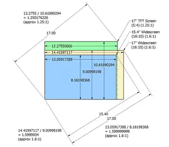 Estimation of monitor size by the distance between opposite corners does not take into account the display aspect ratio, so that for example a 16:9 21-inch (53 cm) widescreen display has less area, than a 21-inch (53 cm) 4:3 screen. The 4:3 screen has dimensions of 16.8 in × 12.6 in (43 cm × 32 cm) and an area 211 sq in (1,360 cm2), while the widescreen is 18.3 in × 10.3 in (46 cm × 26 cm), 188 sq in (1,210 cm2).