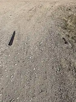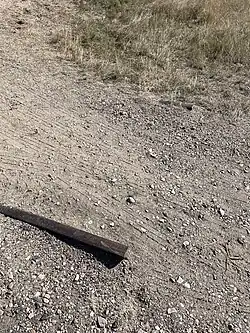 The tracks for the “Milwaukee Road” railroad have been removed East and West of Conata Basin Rd, all but one section of track which still lies under the dirt road. The ends of the rails are visible on either side of the road. (See photos)