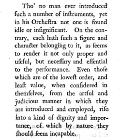 If the epithet grand, instead of implying, as it usually does, many parts, or a Concerto requiring a great band or Orchestra, had been here intended to express sublimity and dignity, it might have been used with the utmost propriety; for I can recollect no movement that is more lofty and noble than this; or in which the treble and the base of the tutti, or full parts, are of such distinct and marked characters; both bold, and contrasted, not only with each other, but with the solo parts, which are graceful and chantant. Nor did I ever know such business done in so short a time; that movement contains but thirty-four bars, and yet nothing seems left unsaid; and though it begins with so much pride and haughtiness, it melts at last into softness; and, where it modulates into a minor key, seems to express fatigue, languor and fainting.