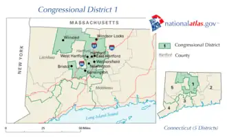 For the 118th and successive Congresses (based on redistricting following the 2020 census), Connecticut's 1st district contains portions of four planning regions and 27 municipalities.[3]