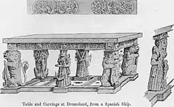 According to tradition of the Barons Inchiquin, Boetius Clancy, then High Sheriff of Clare, presented to Conor the Spanish Armada table in 1588,[2] made from parts of the wrecked Spanish Armada which had landed in Clare. The family were then living at Leamaneh Castle, and it was brought to Dromoland Castle when Conor's great grandson Donough had moved there in 1685 and was stored there for over 300 years before being sold at auction in 2018 by Lord Inchiquin.[3]