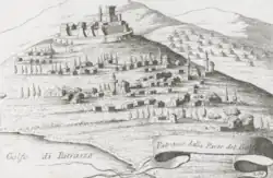 He also placed 35 of the galleys tied by their sterns in pairs back to back, divided in three groups of six pairs, in order to bombard the place while moving continuously so they would not be hit back by enemy fire. The galleys at the front would advance to fire their bow guns, after which the galleys at the back would tow them away from enemy range while reloading, with the groups alternately advancing and falling back.[7] The infantry and the rest of the artillery disembarked at both sides of the istums, commanded by Jerónimo de Mendoza and Girolamo Tuttavilla, Count of Sarno. The artillery was thus placed in three sections.[4]