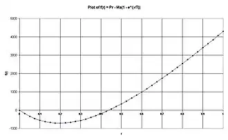 In order to visualise the above as a function of r (for which we wish to determine zeroes), it will be helpful to select numerical values of P0, Ma and T as 10000, 6000 and 3 respectively and plot as shown at right. The function has a minimum value which can be determined by differentiation: