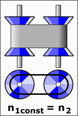 As the distance between the pulleys and the length of the belt does not change, both pulleys must be adjusted (one bigger, the other smaller) simultaneously to maintain the proper amount of tension on the belt. Simple CVTs combining a centrifugal drive pulley with a spring-loaded driven pulley often use belt tension to effect the conforming adjustments in the driven pulley.[5] The V-belt needs to be very stiff in the pulley's axial direction to make only short radial movements while sliding in and out of the pulleys.
