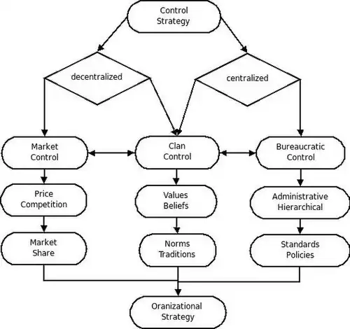 Decentralized control or market control is typically maintained through factors such as price, competition, or market share. Centralized control such as bureaucratic control is typically maintained through administrative or hierarchical techniques such as creating standards or policies. An example of mixed control is clan control which has characteristics of both centralized and decentralized control. Mixed control or clan control is typically maintained by keeping a set of values and beliefs or norms and traditions.