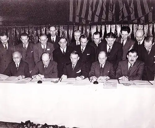 The document was signed on December 7, 1944, in Chicago by 52 signatory states.[1] It received the requisite 26th ratification on March 5, 1947, and went into effect on April 4, 1947, the same date that ICAO came into being. In October of the same year, ICAO became a specialized agency of the United Nations Economic and Social Council (ECOSOC). The convention has since been revised eight times (in 1959, 1963, 1969, 1975, 1980, 1997, 2000 and 2006).[3]