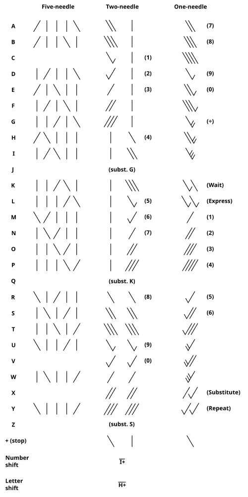 ) are marked on the plates of later needle telegraphs, together with six-unit codes for number shift (