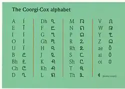 The Coorgi–Cox alphabet is an alphabet[1] developed by the linguist Gregg M. Cox that is used by a number of individuals within Kodagu district of India to write the endangered Dravidian language of Kodava, also known sometimes as Coorgi.[2]