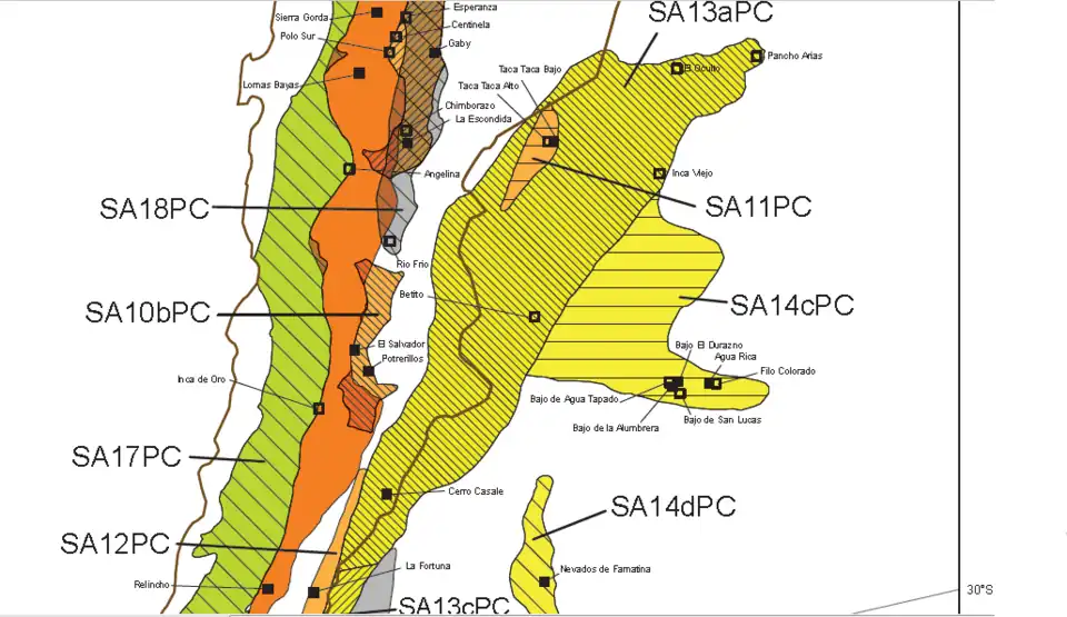 - ^ Maksaev, Víctor; Townley, Brian; Palacios, Carlos; Camus, Francisco (2006). "6. Metallic ore deposits". In Moreno, Teresa; Gibbons, Wes (eds.). Geology of Chile. Geological Society of London. pp. 179–180. ISBN 9781862392199.