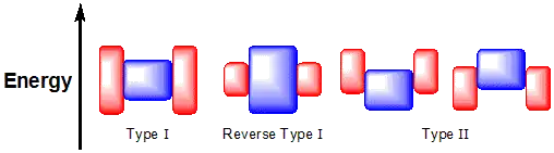 The three types of core–shell nanocrystals. The upper and lower edges represent the upper and lower energy edges of the core (blue) and the shell (red).