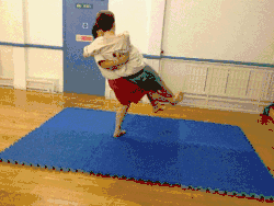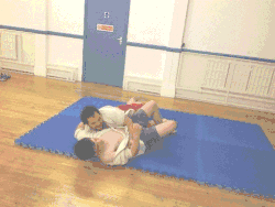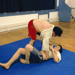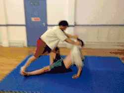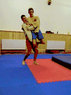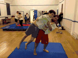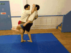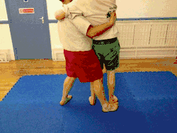 - The thrower moves their dominant foot in front of the throwee's dominant foot while pulling up the throwee's arm and tucking their dominant elbow into the throwee's armpit (keeping hold of the grips on the jacket).