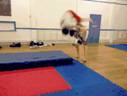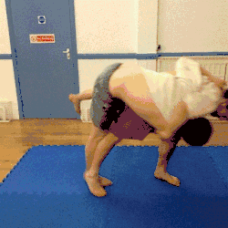 - With both hips now facing the same direction, the thrower lifts the throwee with their legs and flips the throwee head over heels over their shoulder.