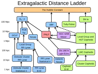 - ^ Adapted from George H. Jacoby; David Branch; Robin Ciardullo; Roger L. Davies; William E. Harris; Michael J. Pierce; Christopher J. Pritchet; John L. Tonry; Douglas L. Welch (1992). "A critical review of selected techniques for measuring extragalactic distances". Publications of the Astronomical Society of the Pacific. 104 (678): 599–662. Bibcode:1992PASP..104..599J. doi:10.1086/133035. JSTOR 40679907.