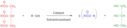 The transesterification reaction by which vegetable oils (red) are reacted with alcohol to yield the associated ester (blue) and glyercol (green). The product esters can be used as biofuel for a variety of purposes.