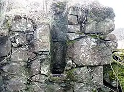 The surviving remains of the hall consist of a rectangular structure on a north-west to south-east axis with a central division that suggest two phases of construction as one half has walls that are narrower than the other. A dominant feature in the northern section is a fireplace with a substantial lintel, the remnants of window locations are discernible.[28] Pink harling was evidently used.[29] Prominent slots feature in the southern section of the surviving building may have been used for timber beams hinting at a cruck and thatched roof on a single storey building.[30]