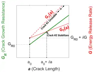 Conceptually, the energy release rate , can be thought of as the energetic gain associated with an additional infinitesimal increment of crack extension, while can be thought of as the energetic penalty of an additional infinitesimal increment of crack extension. At any moment in time, if then crack extension is energetically favorable. A complication to this process is that in some materials, is not a constant value during the crack extension process.[1] A plot of energy release rate versus crack extension for a particular loading configuration is called the driving force curve. The nature of the applied driving force curve relative to the material's R-curve determines the stability of a given crack.