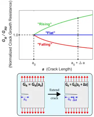 Physically, the dependence of on is indicative that in rising R-curve materials, the phenomena which are energetically costly during crack propagation are evolving as the crack grows in such a way that leads to accelerated energy dissipation during crack growth. This tends to be the case in materials which undergo ductile fracture as it can be observed that the plastic zone at the crack tip increases in size as the crack propagates, indicating that an increasing amount of energy must be dissipated to plastic deformation for the crack to continue to grow.[3] A rising R-curve can also sometimes be observed in situations where a material's fracture surface becomes significantly rougher as the crack propagates, leading to additional energy dissipation as additional area of free surfaces is generated.[4]