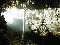 A potholer beside the column in Crackpot Cave