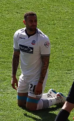 In January 2013, Championship rivals Bolton Wanderers made a successful £300,000 transfer bid for Davies, and began negotiating personal terms.[68][69] He agreed to a two-and-a-half-year deal, and became Dougie Freedman's first permanent signing as the "Trotters" manager.[70] He made his debut for Bolton on 19 January, as a late substitute for Darren Pratley in a goalless draw with Crystal Palace at Selhurst Park.[71] He scored his first goal for Bolton on 9 February in a 2–1 win over Burnley at the Reebok Stadium,[72] and followed this up with the equalising goal for Bolton in a 1–1 draw with Nottingham Forest at the City Ground just a week later.[73] He was sent off after receiving two yellow cards in a 3–2 defeat to Charlton Athletic at The Valley on 30 March.[74]