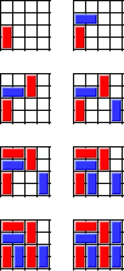 In 2009, Martin Schneider computed the Grundy values up to the 3 × 9, 4 × 5 and 5 × 7 boards.[3] In 2010, Julien Lemoine and Simon Viennot applied to the game of Cram algorithms that were initially developed for the game of Sprouts.[4] It allowed them to compute the Grundy values up to the 3 × 20, 4 × 9, 5 × 9, 6 × 7 and 7 × 7 boards.[5] Piotr Beling extended these results up to the 6 × 9, 7 × 8, and 7 × 9 boards.[6]