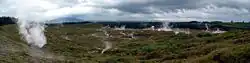 In 1859 Ferdinand von Hochstetter, an Austrian geologist who travelled through the area, reported a colossal column of steam from the Karapiti Blowhole (fumarole), observable from about 20 km away. It was difficult to approach because steam vents and springs covered the valley floor and the ground was warm, soft, iron-stained clay for great distances around.[1] By the beginning of the 20th century the Blowhole was a tourist attraction, albeit not of the level of the nearby Wairakei Geyser Valley.[2] It is worthwhile reading the "Impression of a Trip" in 1927, in which the Karapiti Blowhole is named "the safety valve of the North Island":
