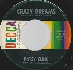 "Crazy Dreams" was issued as a single on August 1, 1960 on Decca Records (which Four Star licensed its music to).[5][6] It was Cline's final single issued in her contract with Four Star and she would eventually record full-time with the Decca label.[7] Cline promoted the track on the radio program, Country Style U.S.A., in September 1960.[8] The song has since received positive reception from writers and critics. Thom Jurek of AllMusic named it an "album pick" when reviewing Cline's 1991 box set titled The Patsy Cline Collection.[9] In a separate AllMusic review, Jurek called the song "criminally-ignored".[10] Ellis Nassour of the biography Honky Tonk Angel: The Intimate Story of Patsy Cline called the song "wonderful" and credited its backing musicians for its quality.[4]