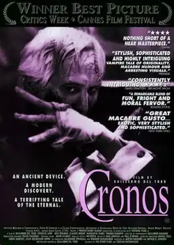 Cronos is a 1992 Mexican independent horror drama film written and directed by Guillermo del Toro and starring Federico Luppi and Ron Perlman. Cronos is del Toro's first feature film, and the first of several films on which he worked with Luppi and Perlman.