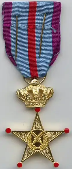 The Cross of Honour for Military Service Abroad (Dutch: Erekruis voor Militaire Dienst in het Buitenland, French: Croix d'Honneur pour Service Militaire à l'Étranger) is a Belgian military decoration originally established for award to Belgian servicemen who served for a long period of time in the Federal Republic of Germany, Zaire (now Congo), Rwanda or Burundi. It was established on 16 June 1997 in three classes.