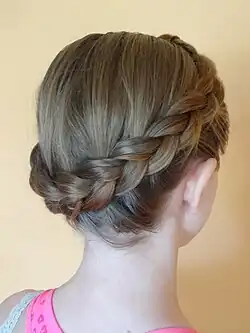 The Crown Braid (German: Gretchenfrisur, or Bauernkrone ["farmer crown"]) is a women's hairstyle that was once popular with European women. It consists of the hair braided and piled atop the head.[1][2] The hair can either be pinned up with bobby pins, or braided around the head in a technique similar to the dutch braid or french braid, adding strands of hair continuously while braiding around the head.