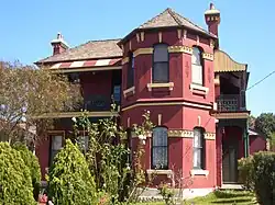 By 1820 a large part of the area had been subsumed by Joseph Underwood's large 'Ashfield Park Estate'. This property remained largely intact for more than 40 years, until it was subdivided into large blocks after the death of Elizabeth Underwood in 1858. By this time its proximity to the railway made it a desirable area (the station was originally called Fivedock).[9] One of these subdivisions was the 'Highbury Estate', on part of which Anthony Hordern, son of the founder of the great retail firm, Anthony Hordern & Sons, eventually built his house 'Shubra Hall', just beyond the west border of Ashfield. It later became part of the Presbyterian Ladies' College, the current boundaries of which give an idea of the extent of the Hordern property.[8] The College, including Shubra Hall, the main school building and the Meta Street entrance gates, is now listed on the Register of the National Estate.[10]