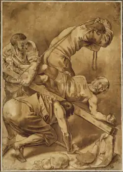 The most striking feature of the painting is its pronounced realism: the saint is "very much the poor fisherman from Bethsaida, and the executioners, their hands heavily veined and reddened, their feet dusty, are toiling workmen", says Helen Langdon.[15] This was the beginning of a new phase in Caravaggio's art where he concentrated on the Christian ethos of humility and salvation through suffering.