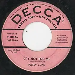 - ^ a b c Cline, Patsy (February 23, 1959). ""Cry Not for Me"/"Yes, I Understand" (7" vinyl single)". Decca Records. 9-30846.
