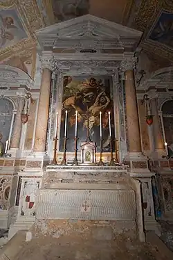 In the walls of the chancel are the six niches designed to hold the statues of the inhumed saints in the crypt, two on the left wall, two on the back wall on either side of the altar, and two on the right wall; four of them were made by Jacopo Lazzari beginning in 1631 and were completed after his death by his son Dionisio beginning in 1644, who remained faithful to his father's design.[83] Each has a semicircular hemicycle flanked by two Ionic columns with smooth shafts and a white marble base and capital, supporting an architrave with a black marble cartouche in the center bearing in gilded letters the name of the saint whose statue was in the niche; these statues (characterized by a reduced depth as they were designed to remain in their respective niches) were supported by a shelf with an angel's head and held by a hook placed at the base of the niche canopy, no longer present; from left to right, the statues were those of: St. Albina, St. Castus, St. Marcianus, St. Innocent, St. Secondinus (although the cartouche bears the name of St. Probus, who had no statue), and St. Eupuria.[84] The architectural frame of each niche ends at the top with an alternating semicircular and triangular tympanum, in the center of which is an angel's head.[85] Inside the two niches on either side of the altar are modern processional reliquary busts of Saints Erasmus (on the left, in the niche of St. Innocent) and Marcianus (on the right, in the niche proper).[69]
