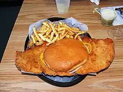 The horseshoe sandwich is rarely seen outside Springfield, Illinois. The original version from Springfield was an open-faced sandwich made from a horseshoe-shaped ham steak and two pieces of white toast but it is available with other types of meat like chicken cutlets or hamburger. The sandwich is served with a cheese sauce similar to Welsh rarebit and french fries.[57]