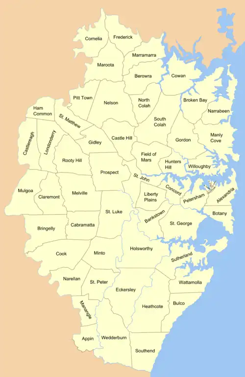 In 1835, Cumberland County was subdivided into 57 parishes.[2] Previously, the subdivisions of the area since the beginning of the colony were called districts. Many of the parishes founded in 1835 kept the name of the district. Others were named after Anglican churches in the same area. This included three of the four small parishes in the Sydney city area: The Parish of St Philip, which is named after St Philip's Church; the Parish of St James, which is named after St James Church, and is still the name of the region today; and finally the Parish of St Andrew which is named after St Andrew's Cathedral. However, the Parish of St Lawrence gave its name to the church, rather than the other way around.[3] Further out of the city, the parishes of St John, St Luke, St Peter and St Matthew, in the Parramatta, Liverpool, Campbelltown and Windsor areas respectively, have Anglican churches which bear the same saints names; St John's in Parramatta (opened 1803); St.Luke's in Liverpool (building began 1818); St.Peter's in Campbelltown (opened 1823, the third oldest Anglican church in Australia); and St. Matthew's in Windsor (consecrated in 1822)
