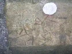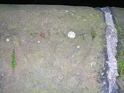 Red sandstone milestones were positioned every mile. Only one survives in the hedge opposite the entrance to the upper Law Mount field, indicating Stewarton 1-mile (1.6 km) and Irvine 63⁄4 miles, another was positioned opposite the entrance to Mid Lambroughton farm and as with the others the only remaining clue is a 'kink' in the hedgerow as seen near Langlands Farm. The milestones were buried during the Second World War so as not to provide assistance to invading troops, German spies, etc.[10] This seems to have happened all over Scotland, however Fife was more fortunate than Ayrshire, for the stones were taken into storage and put back in place after the war had finished.[11]