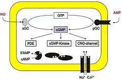 Cyclic guanosine monophosphate (cGMP) is a cyclic nucleotide derived from guanosine triphosphate (GTP). cGMP acts as a second messenger much like cyclic AMP. Its most likely mechanism of action is activation of intracellular protein kinases in response to the binding of membrane-impermeable peptide hormones to the external cell surface.[1] Through protein kinases activation, cGMP can relax smooth muscle.[2] cGMP concentration in urine can be measured for kidney function and diabetes detection.[3]