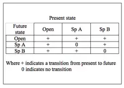 The cyclic model of succession can be displayed in terms of a transition matrix. Based on the Markov chain, the matrix describes the likelihood of future states based on the milieu of present states.[5] The three states in the simplest cyclic model are open substrate (usually a bare patch of land), Species A dominance, and Species B dominance. With respect to facilitation, inhibition, and tolerance models of succession, the key feature of the cyclic model is that A and B are not autosuccessional – that is, they do not facilitate their own growth. Rather, A will either facilitate the succession of B or be eliminated (through mortality) such that the patch occupied becomes open substrate. Likewise, B will either facilitate the succession of A or be eliminated. Open substrate can remain open or become occupied by either A or B. This configuration results in a cyclic scheme of species dominance.