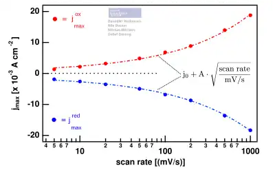 A fit with in the figure shows the proportionality of the peak currents to the square root of the scan rate when additionally is fulfilled.